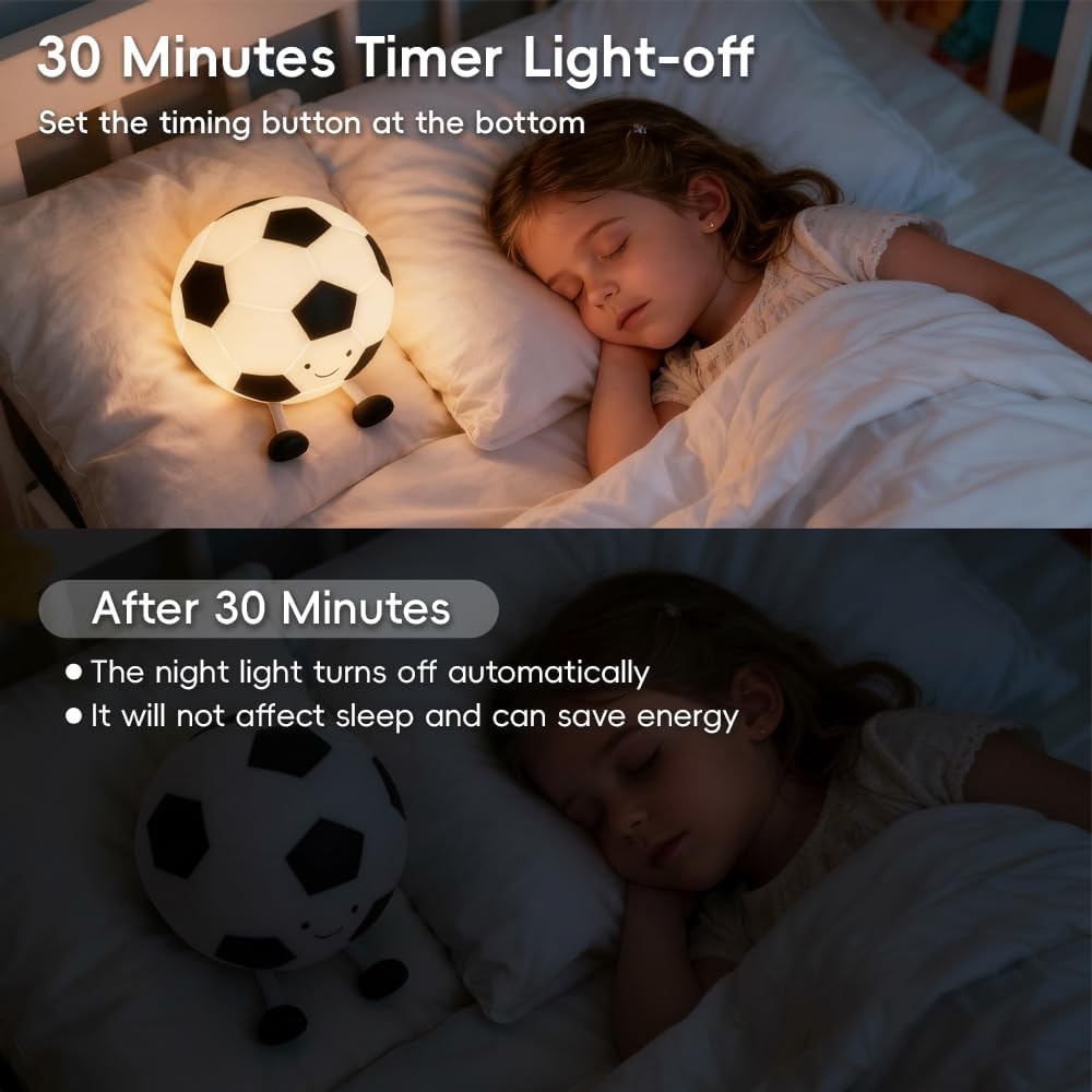 • 【Dimmable and Timer】This soccer night light has three adjustable brightness levels. You can tap the soccer lamp to adjust the brightness according to different usage needs. It also has a timing function, which can be set to turn off after 30 minutes, allowing you to fall asleep peacefully while saving energy