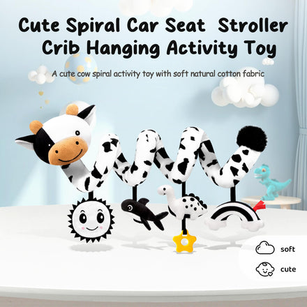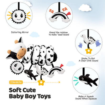 Spiral Car Seat Baby Toys 0-6 Months, Infant Carseat High Contrast Sensory Toys Hanging Stroller Accessories, Newborn Shower Gifts for Baby Boys Essentials Stuff, Cute Black and White Cow