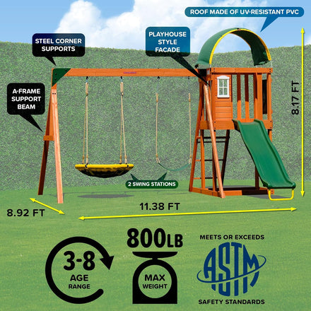 The Sportspower Amelia Wood Swing Set brings all the fun straight to your backyard! The swing set features an extra A frame, that our competition does not have which provides extra stability and safety. The swing set includes 1 sling swing, 2 person padded saucer swing, sandbox, play deck with ladder, canopy roof and a 6ft double-walled, blow-molded slide for extra durability (Some competitors use 3 pc slide with plastic sheet as slide). Sportspower slides include a lifetime warranty. With the variety of play features, your kids will exercise and work on their motor skills, all while having fun. All Sportspower products meet or exceed all ASTM safety standards, so kids and parents can both enjoy the Amelia Wood Swing Set with peace of mind regarding safety as a #1 priority and longetivity of the play set for many many years.