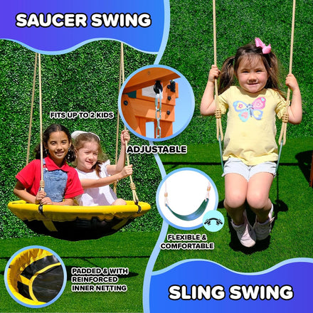 Sportspower Amelia Heavy Duty Wooden A-Frame Swing Set: Saucer + Adjustable Swing, 6ft Blow Molded Slide, Play Fort/Rock Climb Wall + Sandbox, EXCEEDS ASTM Safety Standards*Bonus Anchor Kit*