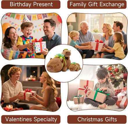 • [Meet Your New Playmate] This soft capybara plush features a lifelike smile and a tiny turtle companion on its back. 2-in-1 Fun: The tiny turtle isn’t just a backpack; its adjustable strap lets your capybara stuffed animal wear it as a hat for a goofy look or snugly on its back for classic cuteness. Perfect for​ kids who love mix-and-match toys or adults craving a whimsical desk buddy!