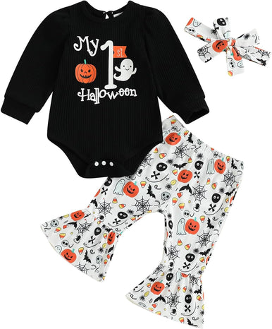 • DESIGNS: Infant girl christmas outfit; christmas baby girl outfit, baby girl christmas romper, newborn christmas outfit girl uses pumpkin smile face ghost, candy corn print, and letter print, santa snowman print, long sleeve, crew neck design; Elastic waist flare pants with turkey and pumpkin print design
