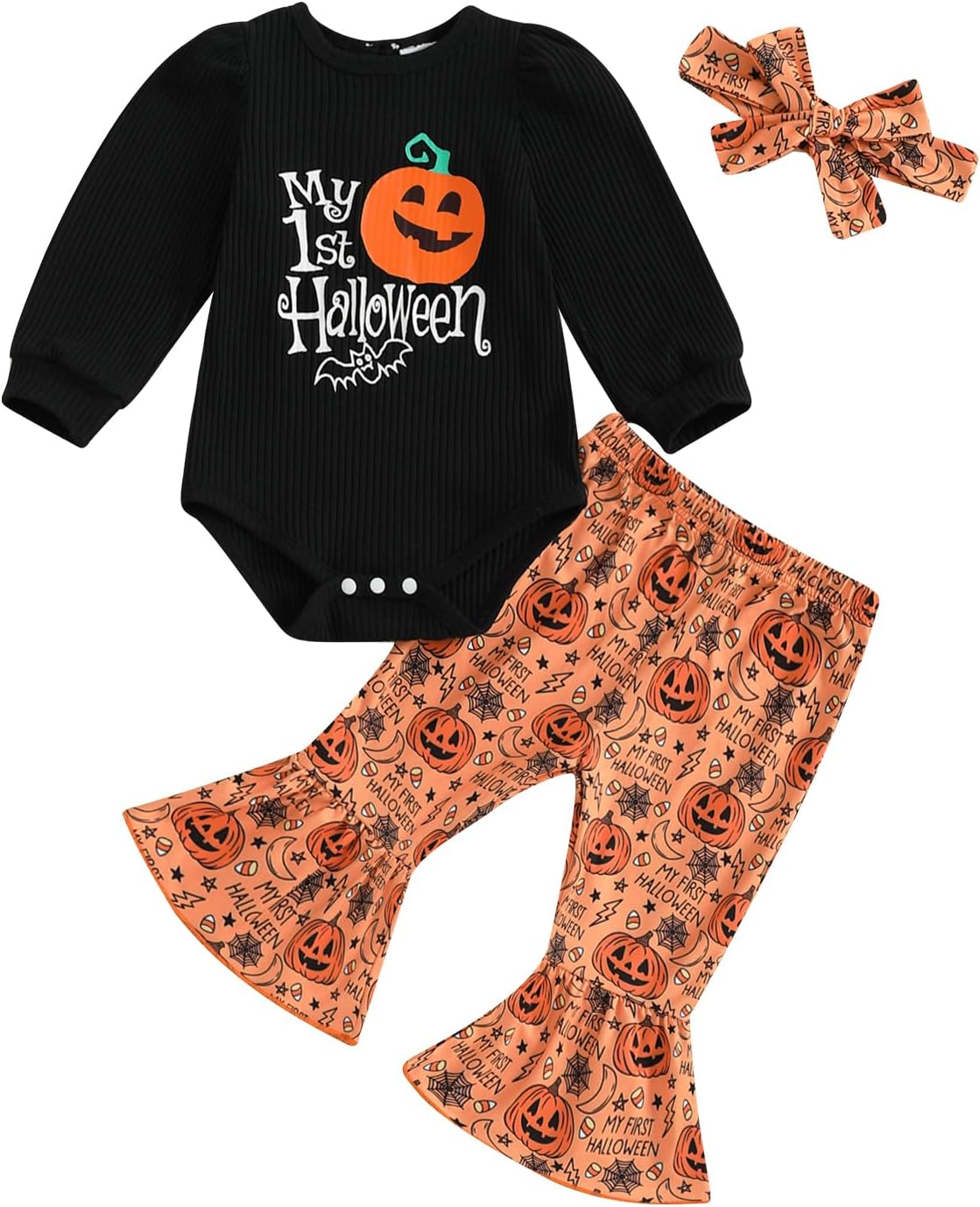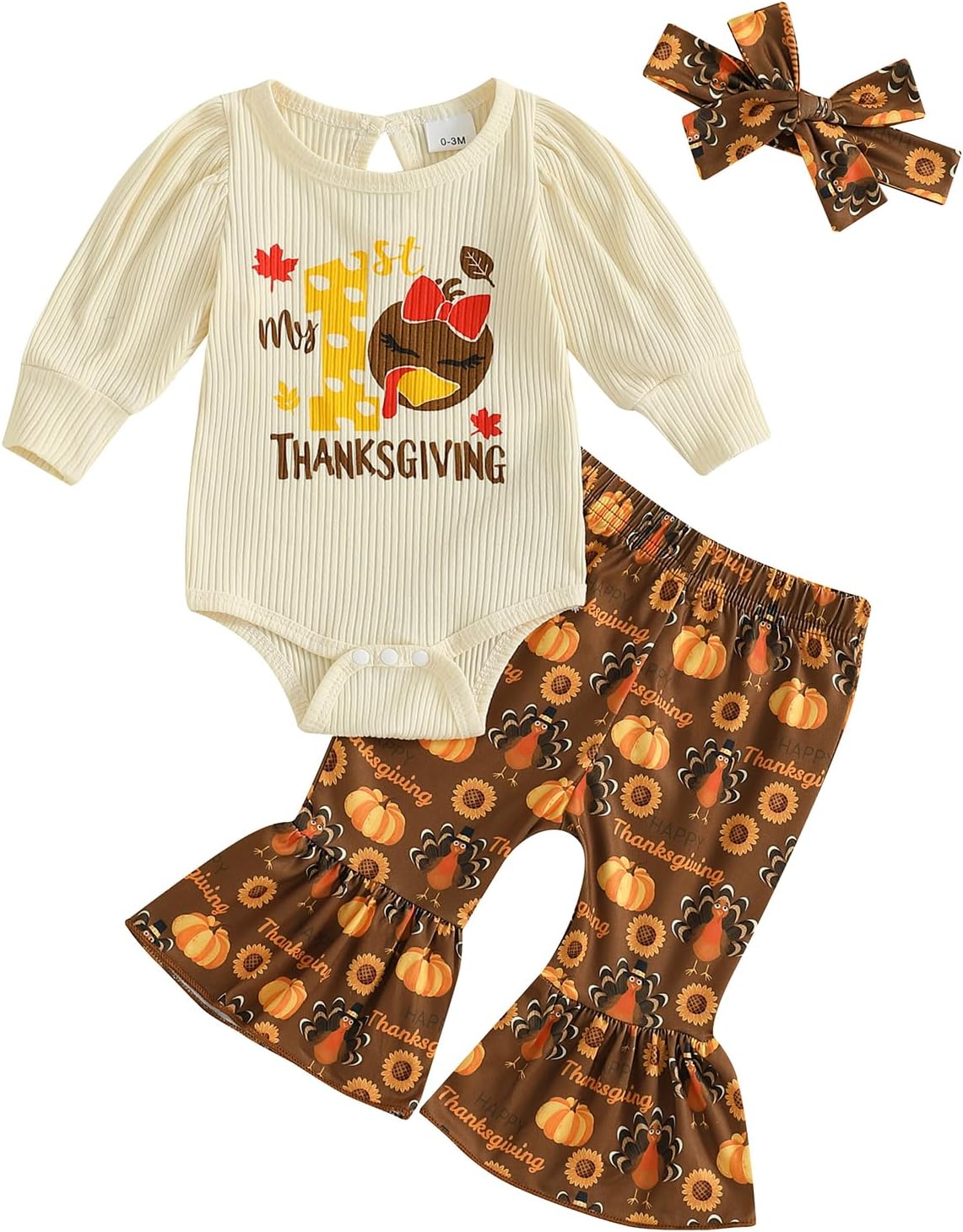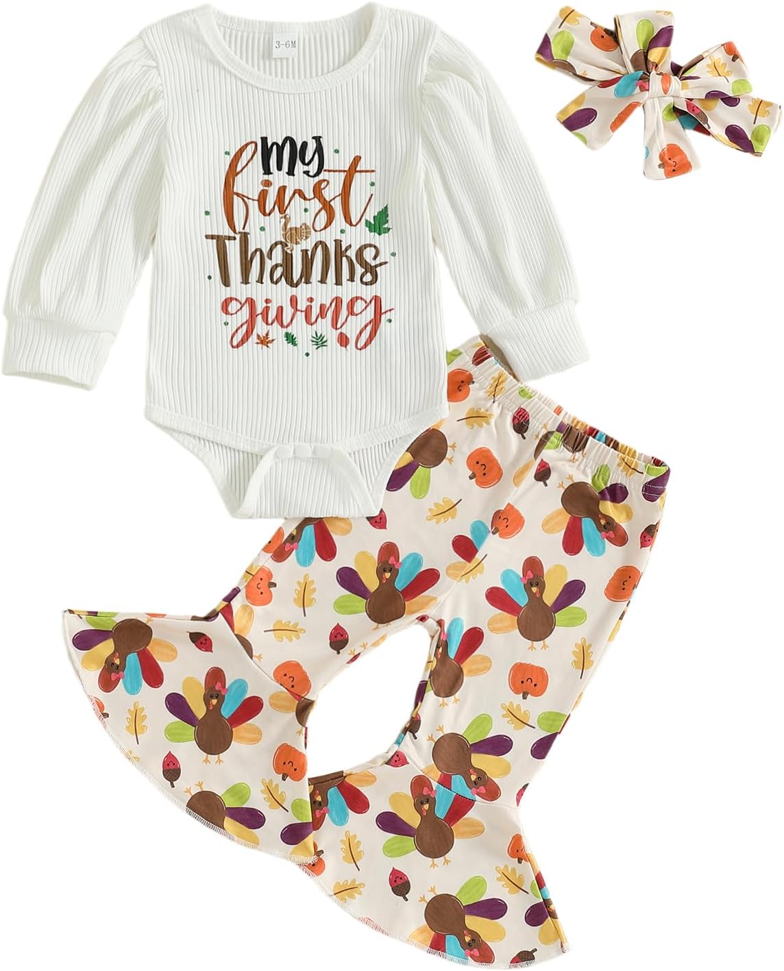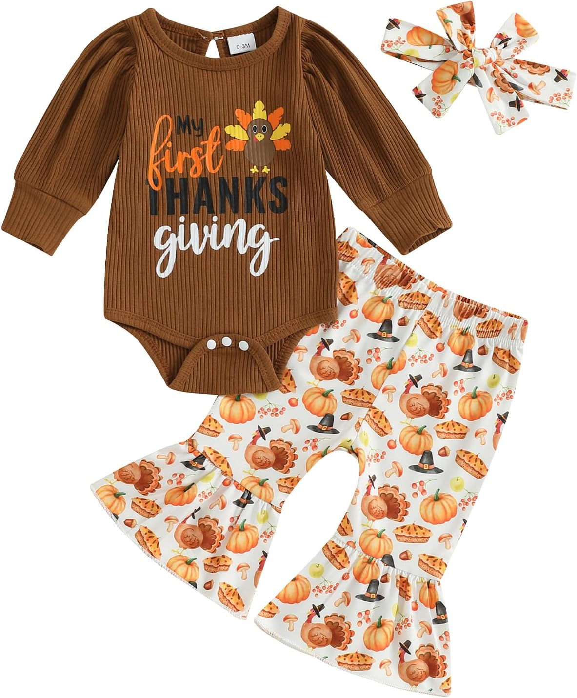 • Package: 1* Baby Girl Ribbed Knit Onesie+1* Baby Girl Flare Pants+1* Baby Girl Headband. (3pcs Clothing Set), Cute baby girl fall clothes, baby girl flare pants set, baby girl turkey outfit, baby girl pumpkin outfit, newborn girl fall clothes