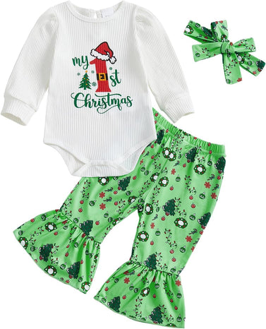 • MATERIAL: Baby girl christmas outfit, my first christmas baby girl outfit,baby girl christmas onesie bell bottoms clothing set is ultra soft, skin-friendly, durable and not easy to deform; Romper is made of 93% cotton and 7% elastane; Pants is made of 95% polyester and 5% elastane