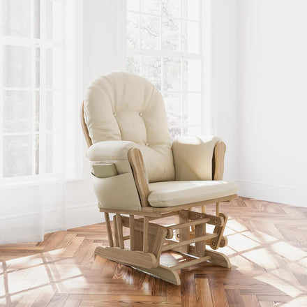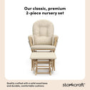 Introducing the GREENGUARD Gold Certified, multi-award-winning Storkcraft Hoop Glider & Ottoman — Storkcraft's signature solid wood, quality-crafted, smooth-gliding 2-piece nursery glider & ottoman set. The Hoop Glider & Ottoman is quality-crafted of solid wood, and is GREENGUARD Gold Certified — meaning it has been screened for over 10,000 chemicals and VOCs known to pollute indoor air, contributing to cleaner, healthier air. Each of the Hoop glider's padded arm cushion includes a convenient side storage pocket to conveniently store any reading materials, electronics, or nursery essentials. The Hoop's applied finish tested to meet or exceed applicable ASTM and CPSIA safety standards. The Storkcraft Hoop Glider & Ottoman is backed by Storkcraft’s 1-year limited warranty and supportive, real-life Customer Care team. Storkcraft, established in 1945, has been internationally recognized with some of the top design and innovation awards, including being named an Honorable Mention in the 2024 Fast Company Innovation by Design Awards. Easy, 30-minute assembly (two people recommended for assembly). Crafted with love, by Storkcraft — makers of quality nursery and children's furniture since 1945.