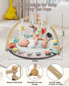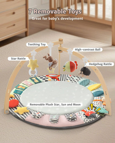 Suihuooo Baby Play Mat Activity Gym,6 Developmental Zones Tummy Time Mat, Foldable Wooden Baby Play Gym with 7 Detachable Sensory Toys for Newborn Brain Development, Essential Baby Shower Set