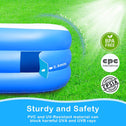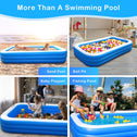 The splashing baby pool is easy to set up. It can be inflated in about 5 minutes by electric or manual air pump (not included) Each air chamber built with 1 air inlet and 1 air outlet valve, it can enhance the sealing effect and prevent air leakage The bottom of the backyard swimming pool is made of thick PVC material with small bump design, to prevent slipping and accidental puncture The two drain valves on the bottom of the pool can be opened and it's very easy to release water and put up for storage This pool is made with 0.4mm thickened PVC material, 200% thicker than most inflatable pool in the market, making it durable and long-lasting even for next summer. Three individual air chambers, each equipped with a leak-proof double-layer air valve can help keep the pool fully inflated during use. It's not only a swimming pool for summer, but also a playpen ball pool for kids indoor and outdoor game. It's larger than the traditional baby ball pits which can accommodate 3-5 children It's a perfect choice to get more fun with this super large swimming pool during your family party. Just put kid's bath toy or fishing toy into the kiddie pool and enjoy your family time Large size (120X 72 X 22 inches) offering ample space for your little one to play, crawl, and explore. It's a sturdy and safety play yard for childern. This is a large size inflatable swimming pool for adults or kids. It can accommodate 2 adults and 3-5 children and with some small pool floats The large inflatable pool has plenty of room to put your favorite swimming toys to increase fun with your kids The inflatable pool is made from thick, Heavy-duty and puncture-resistant PVC material that is safe and an excellent option for your dogs and cats to enjoy refreshing and splashing during the summer It's important for kids to use the inflatable pool under adult supervision Unfold the swimming pool and place it on the level ground Inflate the kiddle pool by the electric or manual air pump through three individual air chambers Fill in 80% water(DO NOT OVER THE MAX LINE) Drain the water from the bottom and it's easy to fold up small for compact storage