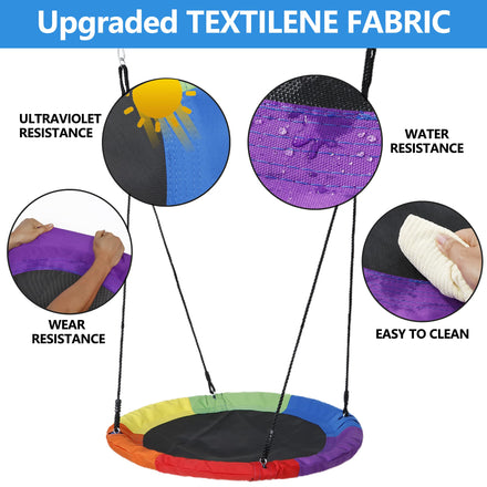 • 【Large Size & Adjustable Height】This rainbow saucer swing is 40 inch diameter which is large enough for multiple children to play together.They don't have to take turns waiting for each other to get off,they can all get on at once. Thick ropes are made from high quality PE webbing with metal rings for secured fastening, it can be adjusted from37 to 70 inch to meet your need when condition changes