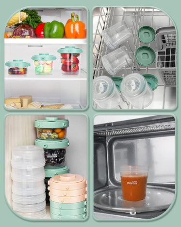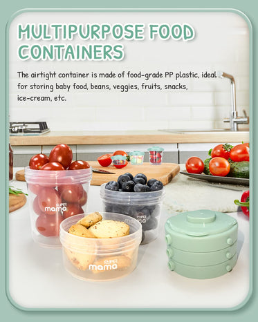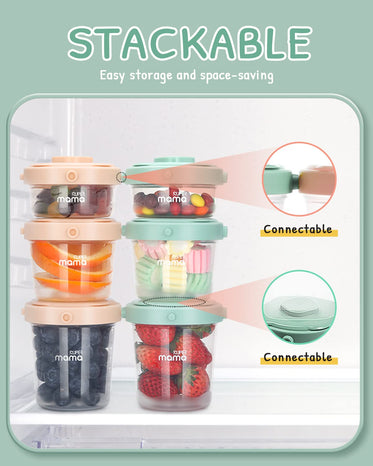 • Airtight and Stackable: Thanks to food storage containers with lids’ secure screw-thread design, our baby food travel containers offer airtight sealing to keep meals fresh and delicious. The leak-proof feature ensures mess-free portability, making it perfect for on-the-go meals in your diaper bag or backpack. And the design of the lid makes baby puree containers stackable to get easily distinguish and space-saving storage