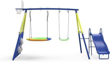 • 5 in 1 Swing Set: This outdoor swing set includes 1 Saucer Swing, 1 PE Waterproof Belt Swing, 1 Glide, 1 Soccer Goal Net and 1 Basketball Hoop to meet various outdoor play requirements, bringing an ultimate fun combination for your kids. Up to 5 kids are able to enjoy this swing set at once and it provides multiple ways to play. This kids swing set also comes with an inflatable football, an inflatable basketball and a pump.