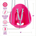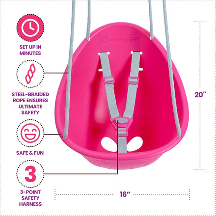 - Simple and Safe Set Up: Swing hanging hardware and everything you need to start swinging is included. Harness straps are adjustable to two different height settings to grow with your child.