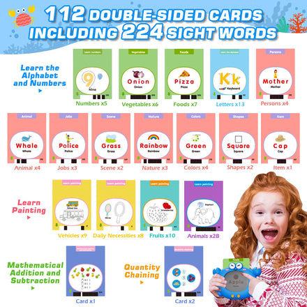 • Perfect Gift: The set includes a crab-shaped card reader, 112 double-sided cards (224 pages), and a USB charging cable. Perfect for kids aged 3 to 6, it's an ideal gift for birthdays, Christmas, and more.