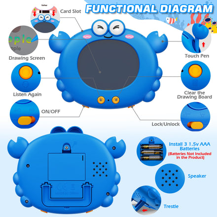 • Easy to use:Just turn it on, insert the card, and it will read aloud. The unique one-button cycle function allows for repeated listening without reinserting the card. Plus, the crab's pincers can be detached and used as a pen for writing letters, drawing, and other activities, making learning fun and interactive for children. Perfect for daily use at home or in educational settings.
