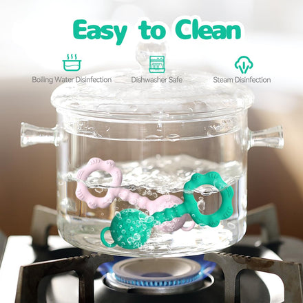 • - Easy to Clean: Use boiling water to clean and disinfect the rattle within 1 minute for first time use. Avoid boiling the teething rattle for a long time. After that, you can use water to clean it easily. If there are stains, just use soap and water to remove them.