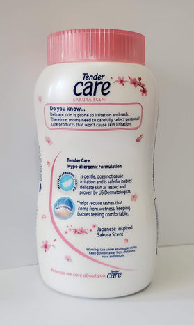 Details: Tender Care Sakura Scent Hypo-Allergenic Baby Powder Tender Care Hypoallergenic formulation is gentle; does not cause irritation and is safe for babies' delicate skin as tested and proven by US Dermatlogists. It helps reduce irritation that comes from wetness; keeping babies feeling comfortable. Give your baby's skin a gentle fine scent that lasts from Tender Care. Enjoy its Japanese-inspired Sakura scent. Warning: Use under adult supervision. Keep powder away from children's nose and mouth. Highlights: Tender Care Hypoallergenic formulation is gentle; does not cause irritation and is safe for babies' delicate skin as tested and proven by US Dermatlogists. It helps reduce irritation that comes from wetness; keeping babies feeling comfortable. Give your baby's skin a gentle fine scent that lasts from Tender Care. Enjoy its Japanese-inspired Sakura scent. Place of Origin Thailand Directions Use under adult supervision. Keep powder away from children's nose and mouth.
