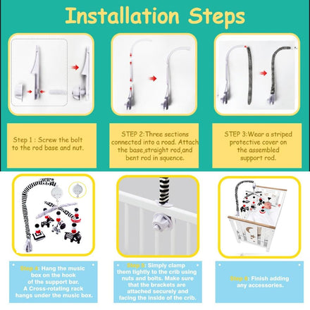 - ♫ MADE FOR BABY'S VIEW - UPGRADED MUSIC BOX, Easy to install, no screw needed,Requires 2 AA (not included). The baby mobile is made of safe ABS material, and the cute soft crib toys are handmade from high-quality stretch cotton, offer your baby harmless using experience. (Before Purchasing, please make sure the edge of your crib suitable for the baby bed holder). Crib mobiles keep your baby entertained, so you can have a little break or complete chores as your baby plays.