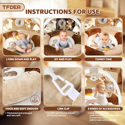 • Comfortable, Large Size: Plush surface is warm and cozy. The tummy time mat is soft and safe, very friendly to your baby's skin. Outer diameter: 33.4 inches, height: 20 inches. Provide children with plenty of space for tummy time exercise and play. Baby gym mat can also be used directly on the floor. The balance of flatness and softness makes your baby more stable when sitting, standing and crawling. It is the perfect infant activity center.