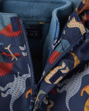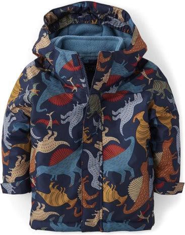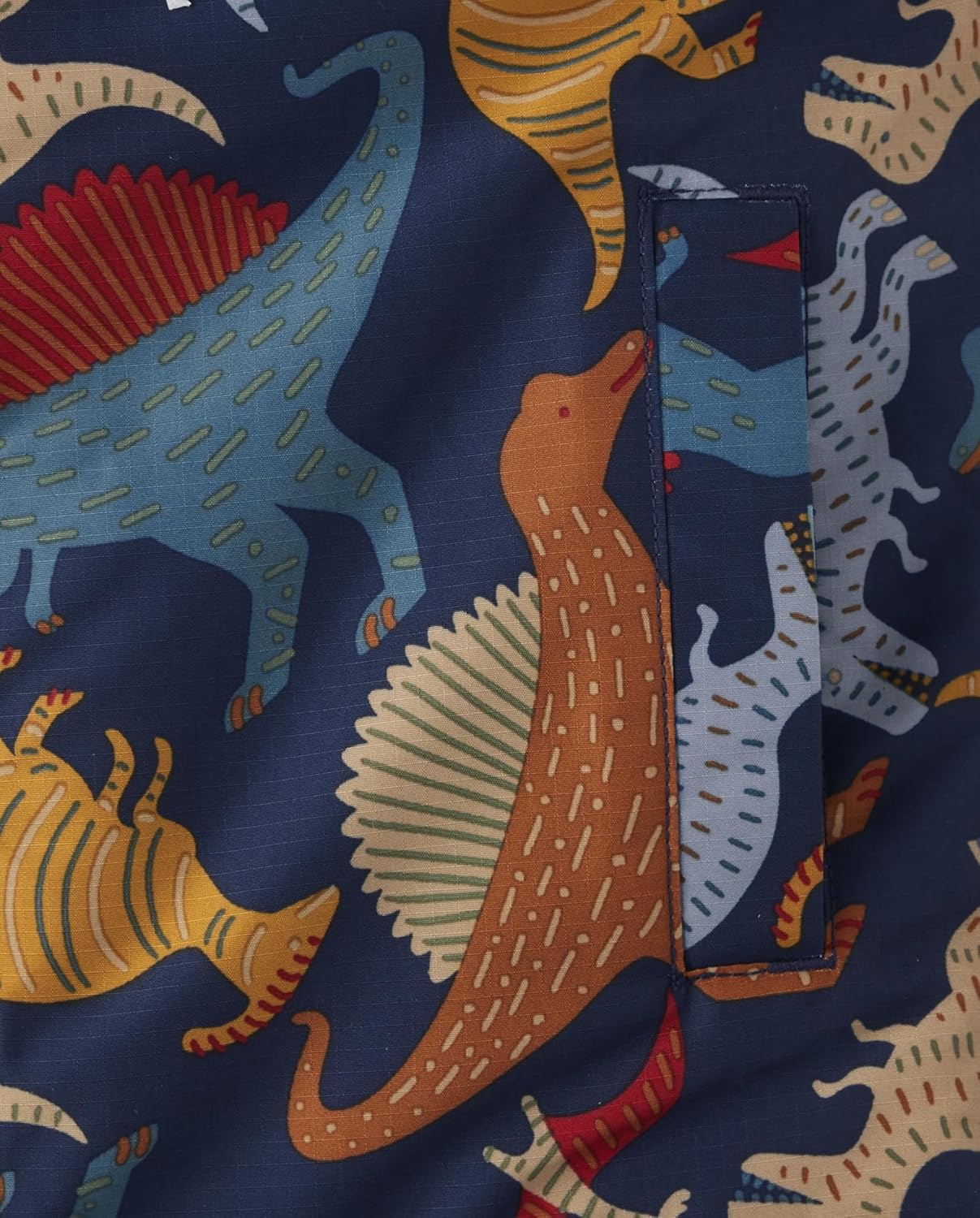 • DESIGN — Outer jacket features adjustable elasticized no-snow cuffs with hook-and-loop closure, side welt pockets, elasticized hood and allover dino print. Solid interior liner features adjustable storm cuffs with hook-and-loop closures and side seam pockets