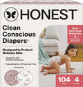 Designed to protect delicate skin, Honest Clean Conscious Diapers keep baby comfortable and dry through all the wiggles and wobbles! Our softest diaper yet delivers up to 100% leak protection with Comfort Dry Technology. The hypoallergenic, plant based inner liner, flexible stretch wings, super absorbent core, and channel technology provide a comfy, secure fit for all ages and stages. Because safety is top priority, these diapers are OEKO-TEX STANDARD 100 Certified, a 3rd party that tests for 350 harmful chemicals, and made with FSC Certified Fluff Pulp and other controlled materials. And for cuteness overload, each diaper features a super cute print!