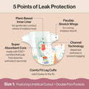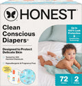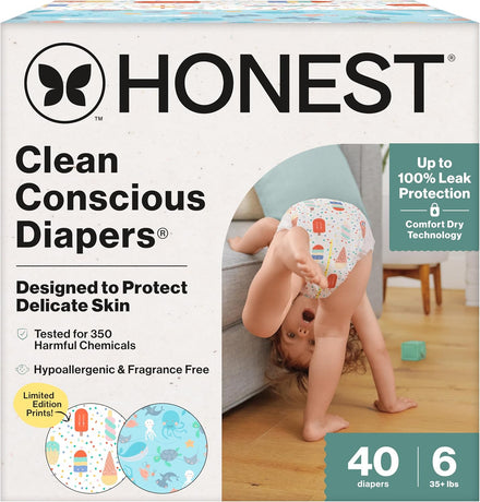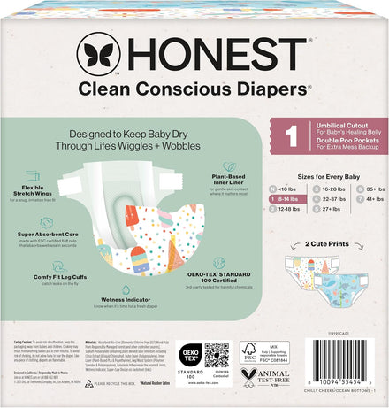 Designed to protect delicate skin, Honest Clean Conscious Diapers keep baby comfortable and dry through all the wiggles and wobbles! Our softest diaper yet delivers up to 100% leak protection with Comfort Dry Technology. The hypoallergenic, plant based inner liner, flexible stretch wings, super absorbent core, and channel technology provide a comfy, secure fit for all ages and stages. Because safety is top priority, these diapers are OEKO-TEX STANDARD 100 Certified, a 3rd party that tests for 350 harmful chemicals, and made with FSC Certified Fluff Pulp and other controlled materials. And for cuteness overload, each diaper features a super cute print!
