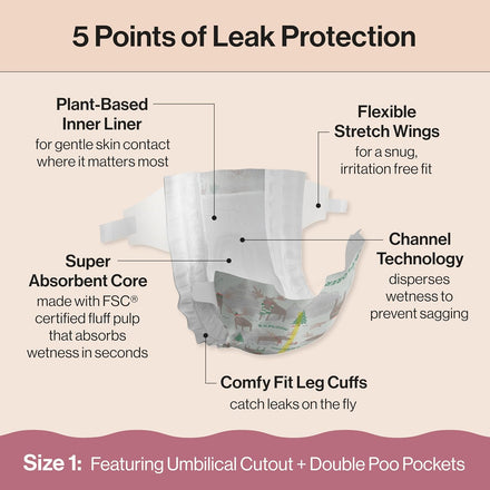 Designed to protect delicate skin, Honest Clean Conscious Diapers keep baby comfortable and dry through all the wiggles and wobbles! Our softest diaper yet delivers up to 100% leak protection with Comfort Dry Technology. The hypoallergenic, plant based inner liner, flexible stretch wings, super absorbent core, and channel technology provide a comfy, secure fit for all ages and stages. Because safety is top priority, these diapers are OEKO-TEX STANDARD 100 Certified, a 3rd party that tests for 350 harmful chemicals, and made with FSC Certified Fluff Pulp and other controlled materials. And for cuteness overload, each diaper features a super cute print!