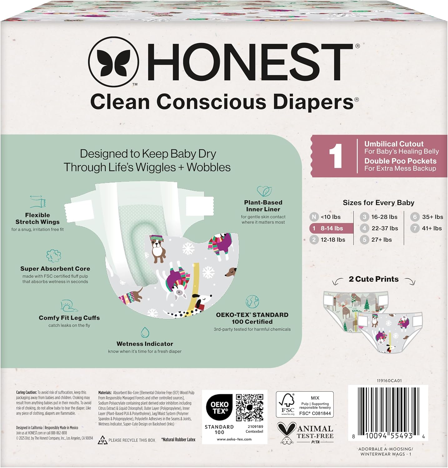 The Honest Company Clean Conscious Diapers for Delicate Skin | Up to 100% Leakproof | Hypoallergenic, Fragrance Free | Winter '25 Limited Edition Prints | Club Box, Size 1 (8-14 lbs), 78 Count