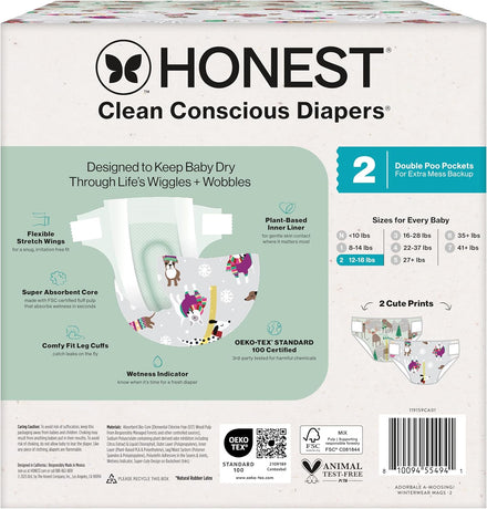 The Honest Company Clean Conscious Diapers for Delicate Skin | Up to 100% Leakproof | Hypoallergenic, Fragrance Free | Winter '25 Limited Edition Prints | Club Box, Size 2 (12-18 lbs), 72 Count