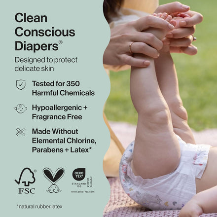 Designed to protect delicate skin, Honest Clean Conscious Diapers keep baby comfortable and dry through all the wiggles and wobbles! Our softest diaper yet delivers up to 100% leak protection with Comfort Dry Technology. The hypoallergenic, plant based inner liner, flexible stretch wings, super absorbent core, and channel technology provide a comfy, secure fit for all ages and stages. Because safety is top priority, these diapers are OEKO-TEX STANDARD 100 Certified, a 3rd party that tests for 350 harmful chemicals, and made with FSC Certified Fluff Pulp and other controlled materials. And for cuteness overload, each diaper features a super cute print!