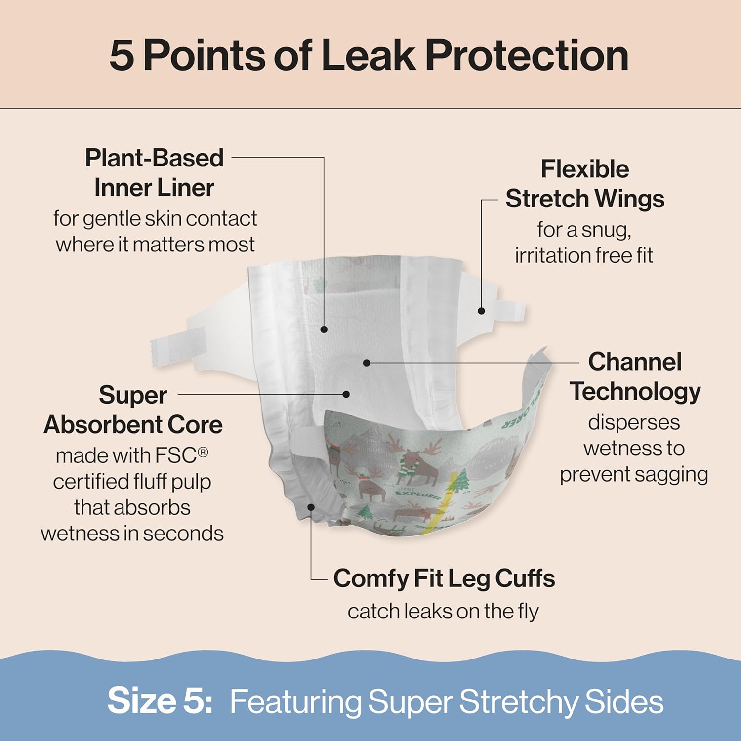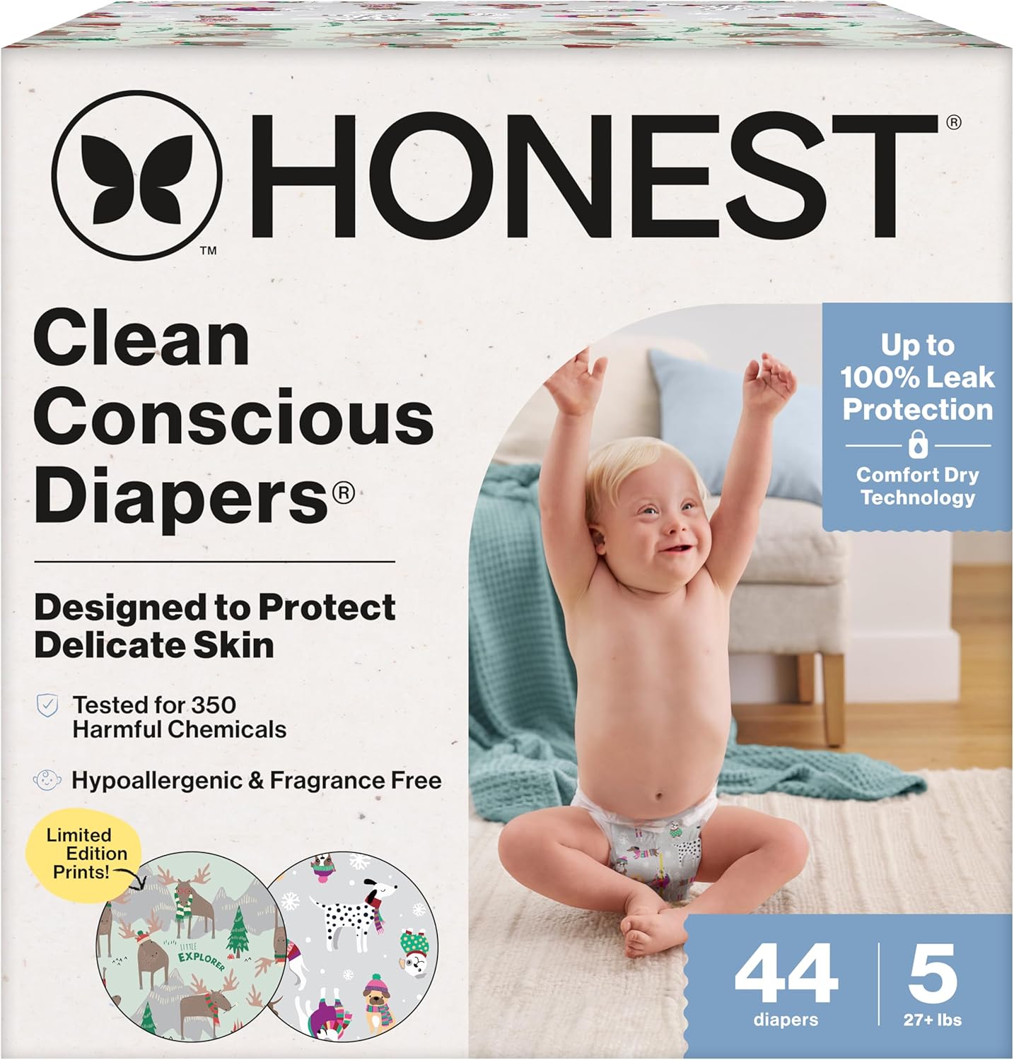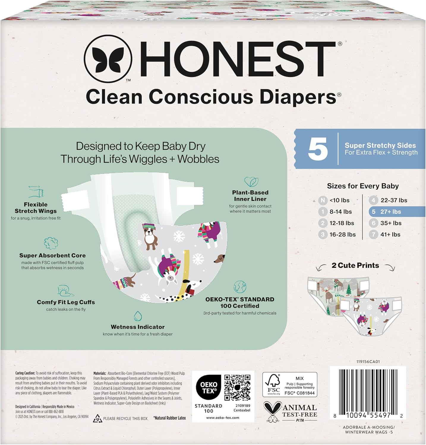 The Honest Company Clean Conscious Diapers for Delicate Skin | Up to 100% Leakproof | Hypoallergenic, Fragrance Free | Winter '25 Limited Edition Prints | Club Box, Size 5 (27+ lbs), 44 Count