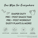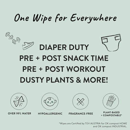• Clean up all of life’s messes. Compostable, plant-based multi-use Wipes are made with over 99% water and only 7 transparent ingredients, making them gentle and safe for baby’s sensitive skin but great for the whole family
