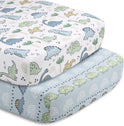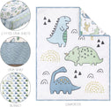 - Dinosaur Theme: Bring the excitement of dinosaurs to your toddler's or baby's nursery with playful blue and green dinos on a beautifully designed crib quilt and baby crib sheets, combined with geometric accents for a charming touch.