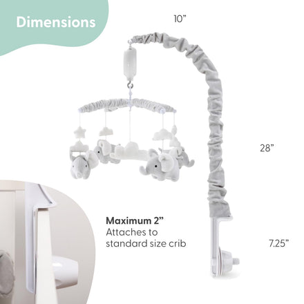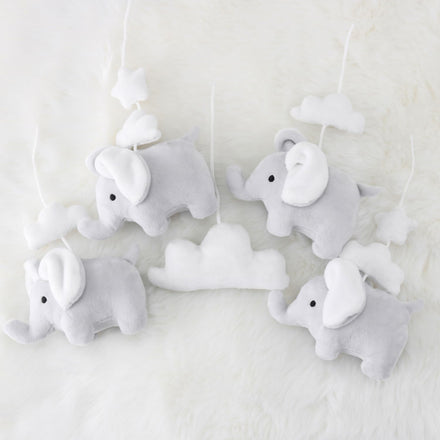 • Elephant Explorer: Bring the fantasy elephants to your baby girl's or boy's crib mobile with adorable grey elephants, clouds, and stars hanging from arms covered in soft grey velour. The mobile crib gently rotates, adding a fun elephant theme to your nursery room.