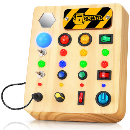 • Light Up Busy Board: Light up switch board toy includes 12 different coloured and sized lights + 12 buttons, knob switches, plugs and mirror