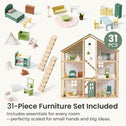 • 31 Pieces of Dollhouse Furniture Included:Comes with 31 pieces of modern wooden dollhouse furniture, uniquely designed for each room. Children can arrange and decorate freely, boosting creativity, fine motor skills, and spatial imagination