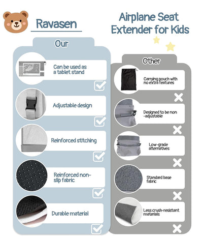 Ravasen creates a comfortable journey in the clouds for your baby. We believe that every journey should be filled with comfort, joy and sweet dreams—especially for the youngest travellers. This portable ergonomic sleep solution transforms any space into a cosy resting place for your child. Designed with both convenience and safety in mind, this toddler plane bed ensures that your child will be able to relax and enjoy the journey, minimising irritation and increasing comfort. The innovative toddler airplane travel cot cleverly fills the gap between two aeroplane seats, extending the length of your toddler's sleeping area and allowing them to stretch out in comfort during the flight. Soft and breathable velour fabric makes your child more comfortable on the toddler airplane bed. The maximum size when unfolded is 31.49*17.7 inches and can hold up to 55lbs, suitable for children aged 1-4 years old. 1 x Toddler Airplane Travel Bed 1 x Carrying Bag(Built-in Tablet Holder) The airplane seat extender for kids allows parents to free their hands and eliminate the fatigue of holding a child on a long flight. It transforms the usually cramped aircraft environment into a comfortable and restful space, helping to reduce restlessness and anxiety for both child and parent. Warm Tips: 1. It can be used for window seats or middle row seats, but not for aisle seats and exit row seats. 2. The toddler airplane bed can be installed after the aircraft reaches cruising altitude.