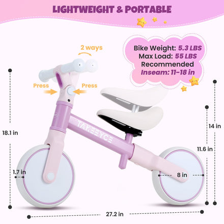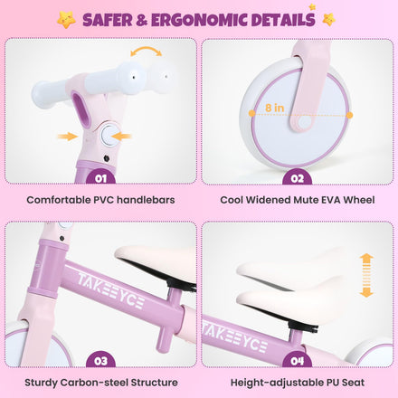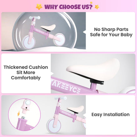 • 【Perfect Gift for Little Ones】Our toddler balance bike is designed to help kids improve their sense of balance and coordination, making it an ideal tool for promoting physical development. In addition, it enhances kids' motor skills, helping them gain confidence as they explore the world around them. The baby balance bike would be the perfect gift for toddler boys & girls over 18 months for holidays like Christmas, birthday, or New Year, etc. If you have any questions, please contact us.