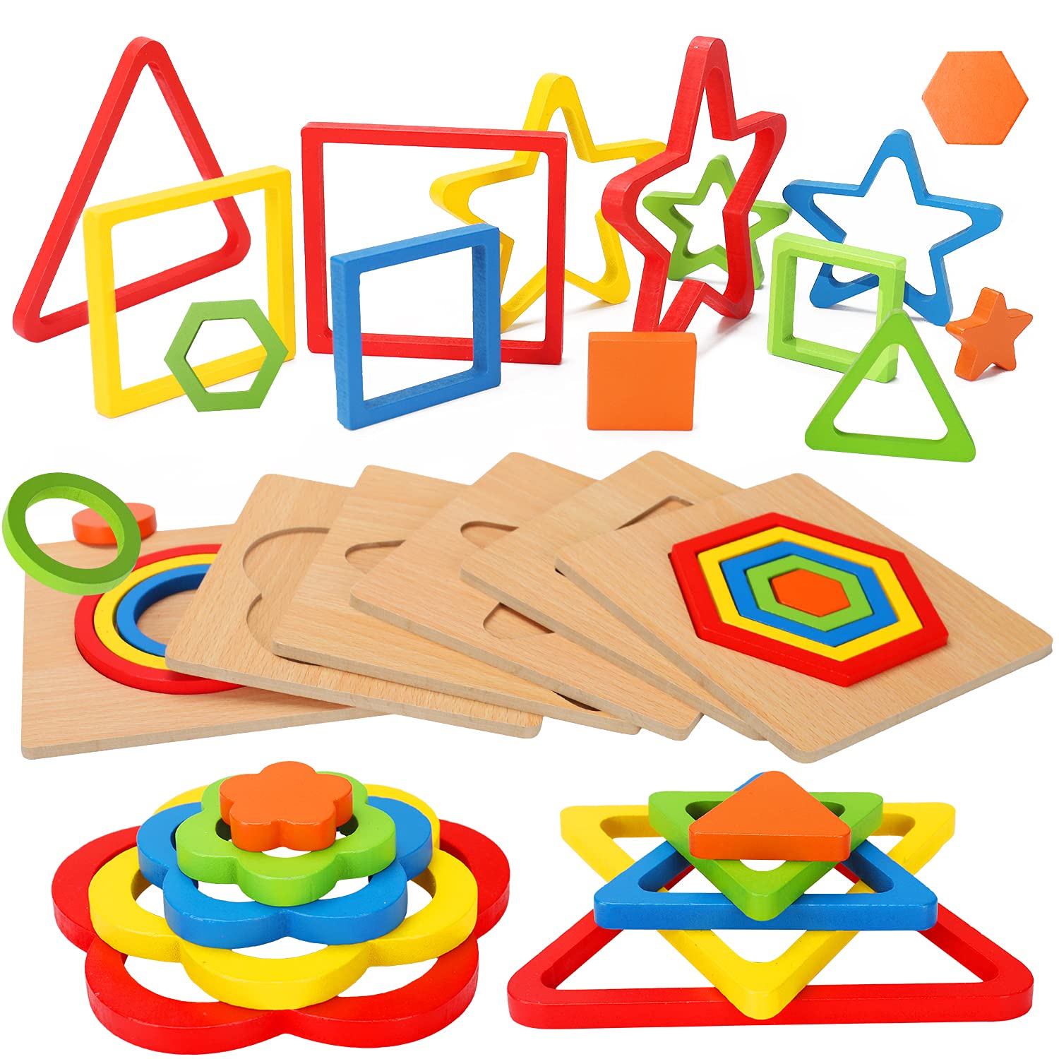 • ✿ Toddler Puzzles:The wooden toys include flower, square, circle, triangle, star and hexagon puzzles, each shape blocks coming with a board. Great cause and effect toys for kids to identify different shape puzzles, colors and sizes of the puzzle blocks, great toddler block Montessori toys for 2 year old. Christmas gift for toddlers.