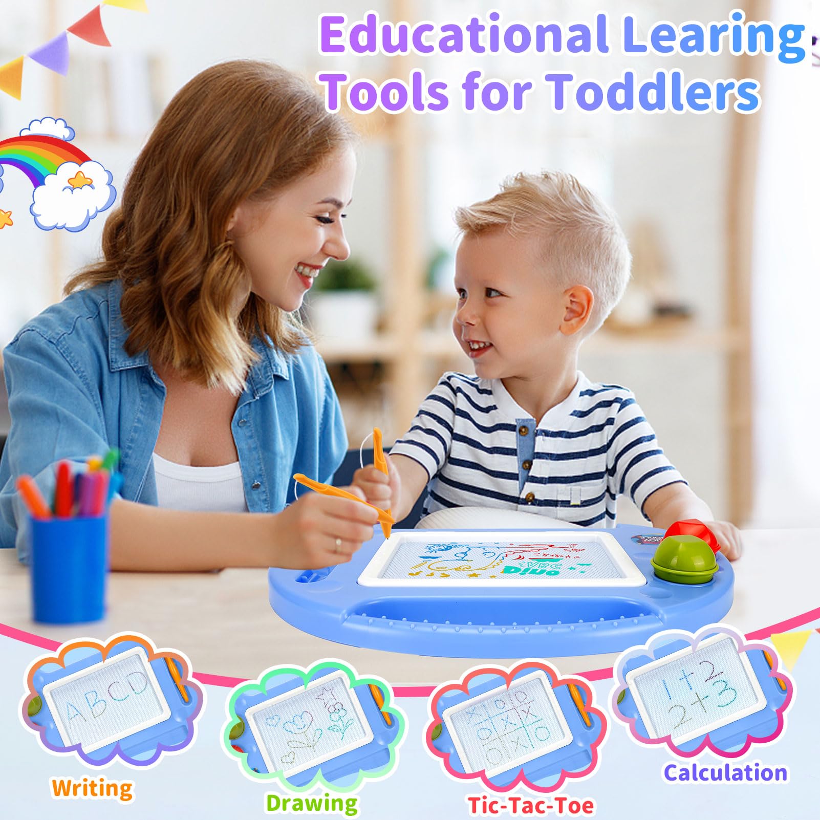• Colorful BABLOCVID Magnetic Drawing Board: Toys for 1 2 3 year old boy magnetic drawing board table has 4 color areas: red, blue, green and yellow. Two year old boy gifts colorful magnetic erasable doodle board is helpful to educate children to learn color, and cultivate their ability of writing and painting. Toys for 2 + year old boy develop children's creative imagination. Besides painting, toddlers can exercise arithmetic and writing on the drawing board.Good gift choice valentines day gifts easter gifts for kids