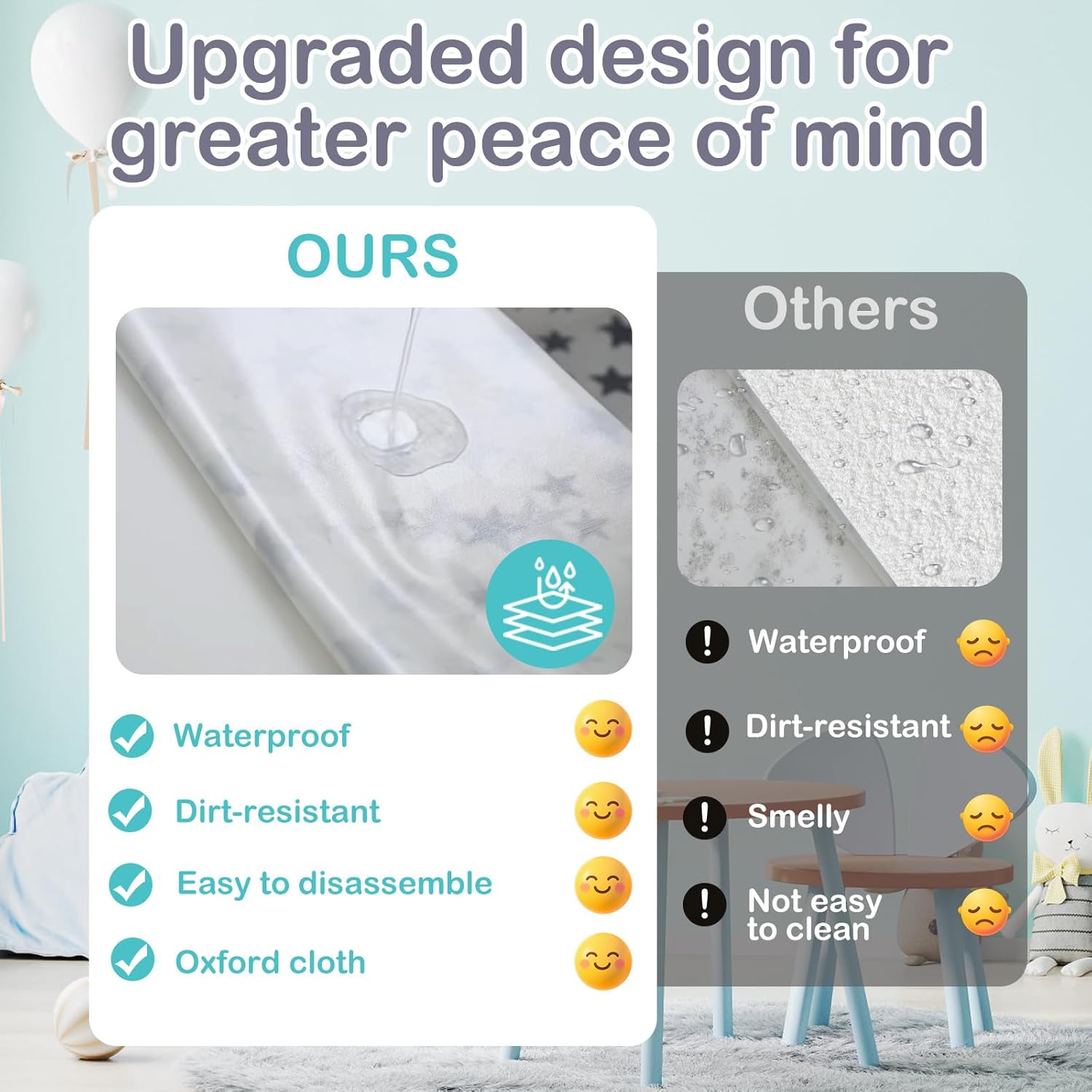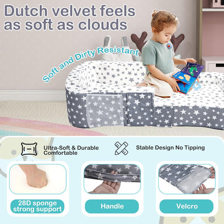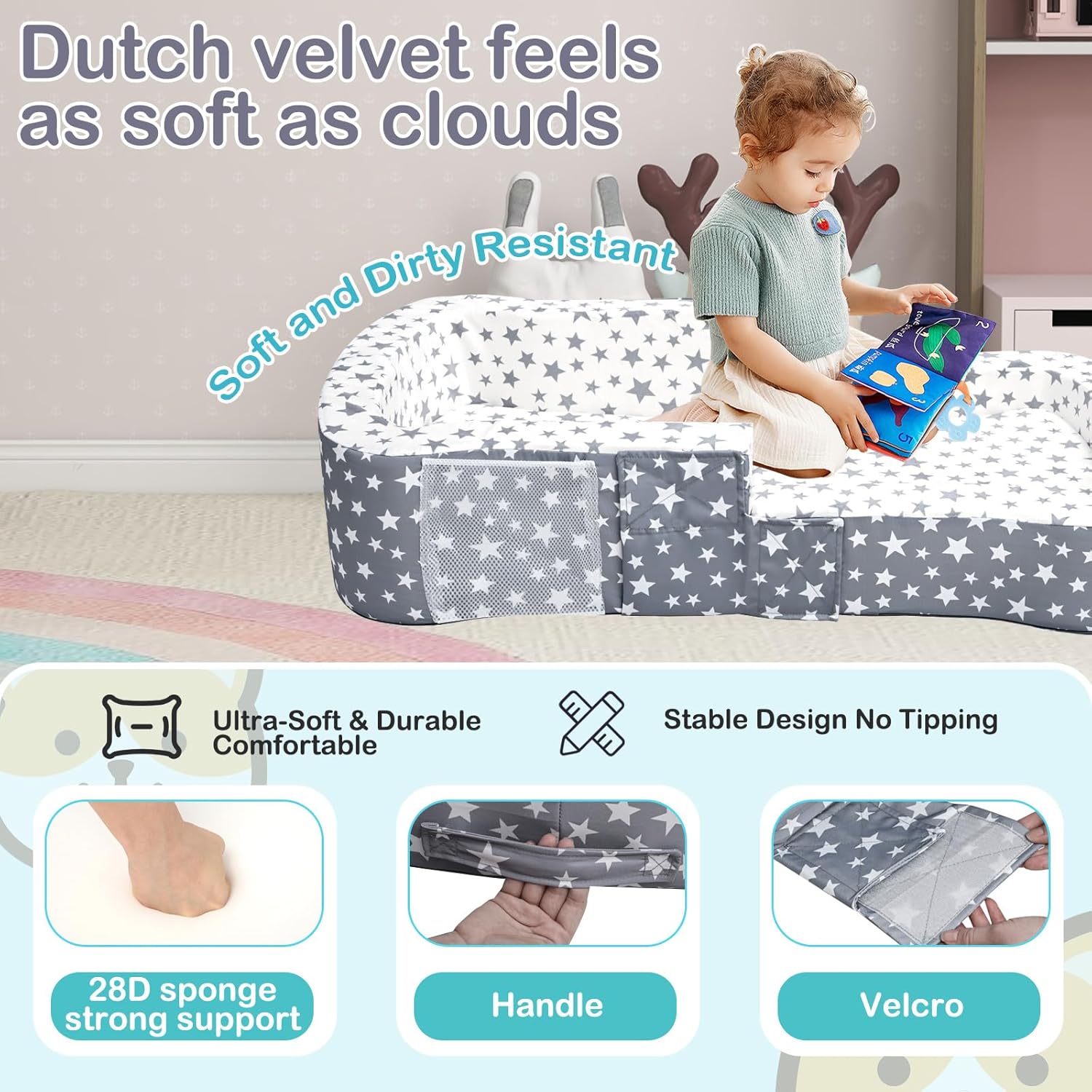 - High-end Comfort and Durability:Toddler travel bed made of soft Dutch fleece (star pattern) and Oxford fabric on the outside, toddler bed is paired with a 28D high-density sponge pad to provide comfortable support for the baby.The built-in waterproof layer effectively prevents leakage.The dirt-resistant and detachable cover (with a high-quality zipper design) supports machine washing, making cleaning more convenient.