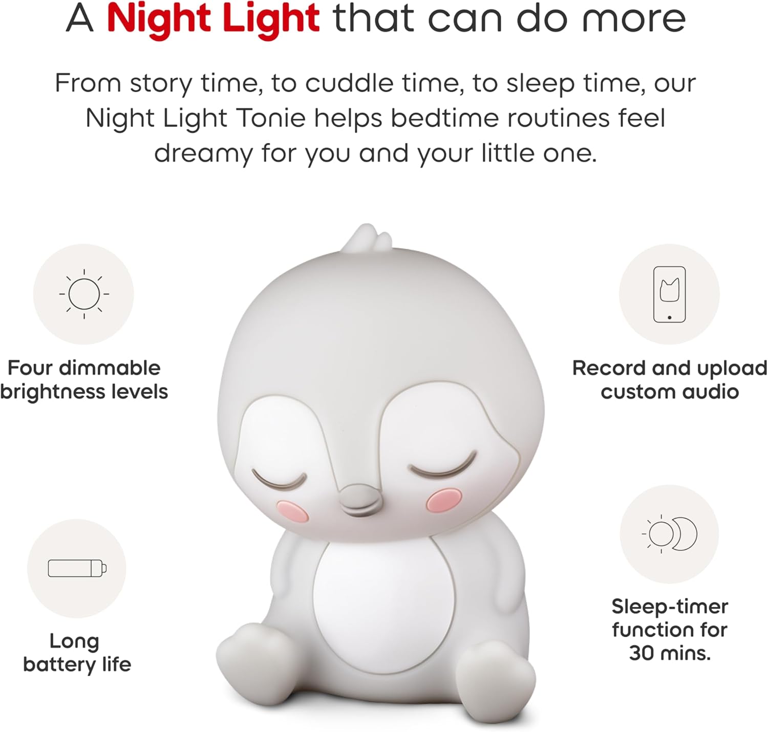 • Light That Calms - Use the Sleepy Penguin Night Light on or off your Toniebox. Includes 4 dimmable brightness levels, to accompany you and your little one throughout the different sleepy time stages—from winding down to helping little ones fall back to sleep on their own.