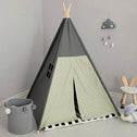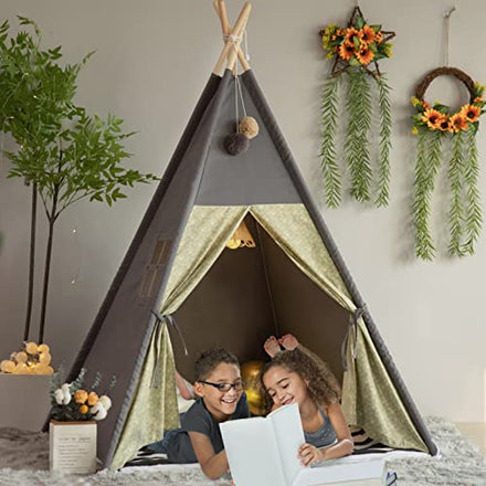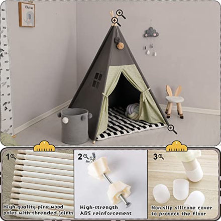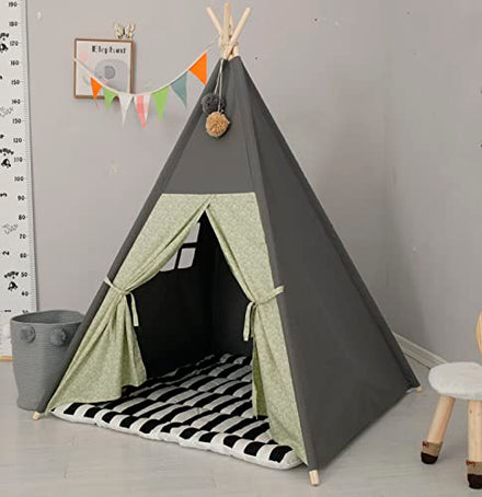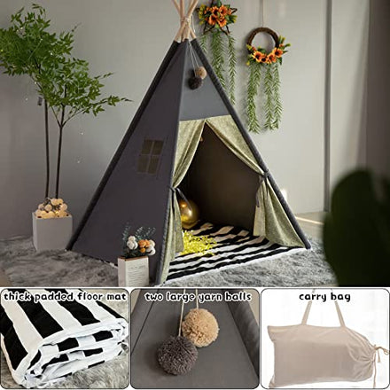 TreeBud Teepee Tent for Kids Stripe Padded Mat Foldable Dark Tone Grey Play Tents for Girl and Boy with Carry Case Wooden Pole Printing Canvas Tepee Playhouse for Child Indoor Outdoor