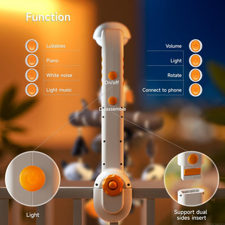 • Multifunctional Baby Crib Toys: Built-in multiple lights of different colors, multiple music (sleep music, nature sounds, piano music). The projector can project a starry sky scene with soft lights, and can also be used as a night light. Create a soothing sleeping environment for your baby.