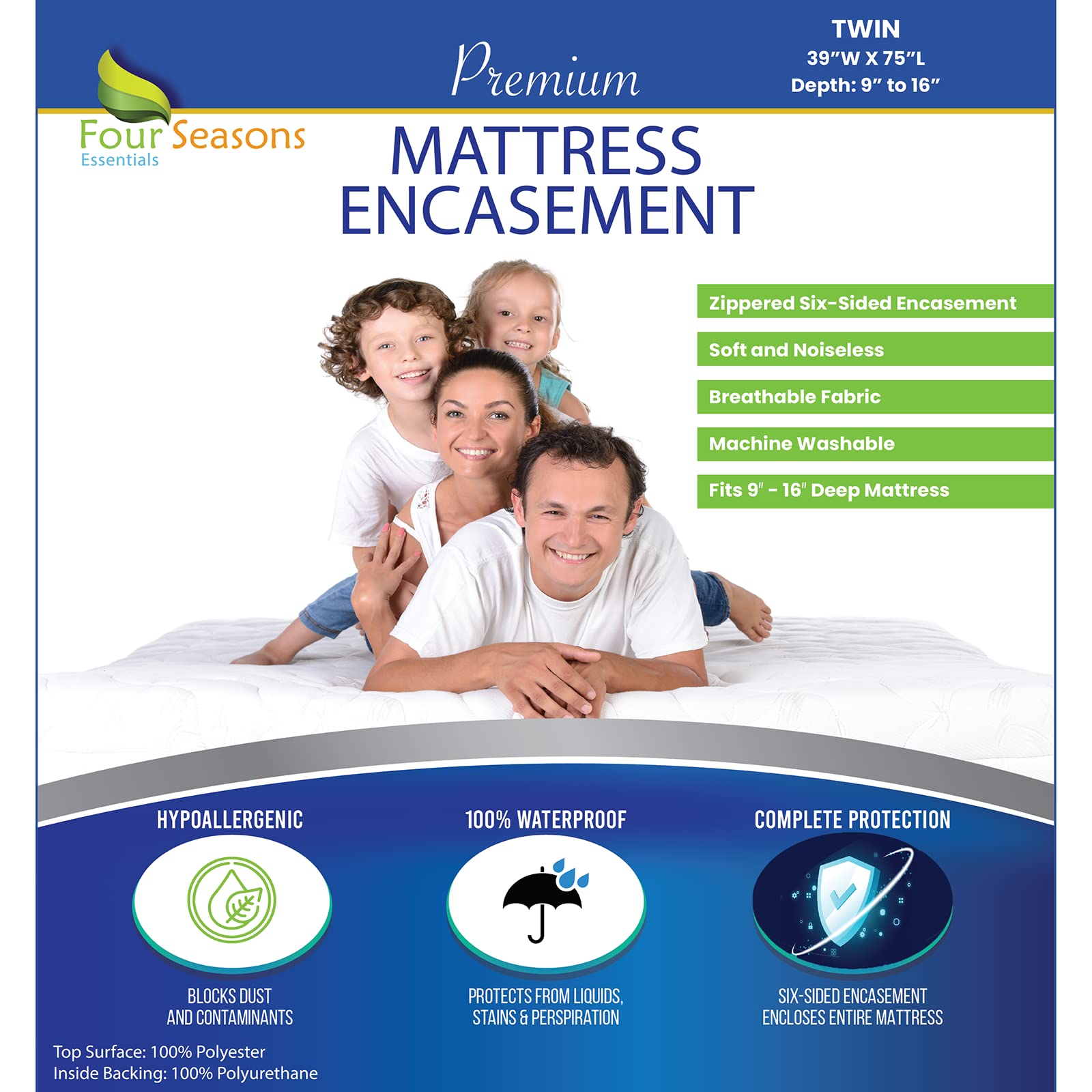 • DURABLE & LONG-LASTING - Made of high quality polyester (surface) and polyurethane (inside lining). Featuring a 3” secondary polyester lining wrapping all around the zipper seam for additional durability and added support. This six-sided stretch fabric zippered mattress encasement is built to fit any Twin size mattress that is 9” to 16” deep. Machine washable for easy cleaning and lasting use.
