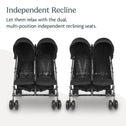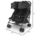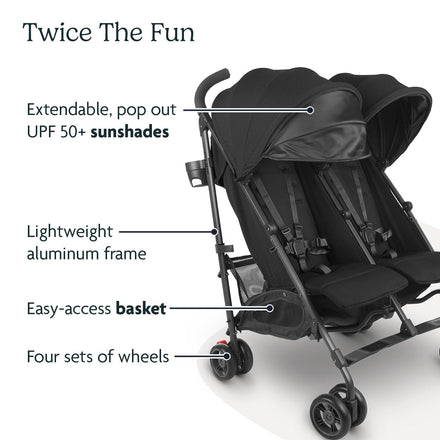 Details: Suitable from 3 months up to 55 lbs/seat Elevated look/feel and branding that follows suit w/ the rest of our stroller line darker touch points Powder-coated frame for higher resistance wear Lightweight frame with side-by-side seats Independent one-handed, adjustable recline with three positions Multi-paneled canopies with extendable UPF 50+ sunshades Four sets of wheels (vs. the traditional six) Simple, quick fold – no foot action required Carry handle for easy transport when folded Large, easy-access basket with 10 lbs weight limit Storage pocket on back of canopies (2 lb weight limit each) Removable cup holder