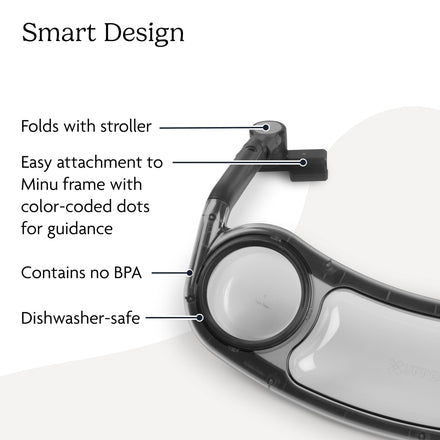 Details: Keep your toddler satisfied while strolling with the perfect snacking surface and drink holder that attaches to the Minu V3 stroller. • Wipeable surface for quick clean-ups • BPA-free and food safe for healthy on-the-go snacking