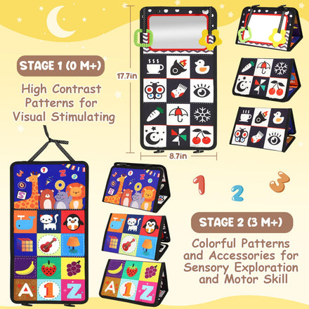 • High Contrast Patterns for Early Visual Development: This tummy time toy is suitable for babies aged 0-12 months. The high contrast black and white patterns are perfect for newborns (0-3 months), capturing their attention and supporting early visual development. For babies over 3 months, the colorful patterns stimulate their growing senses and encourage motor skill development.