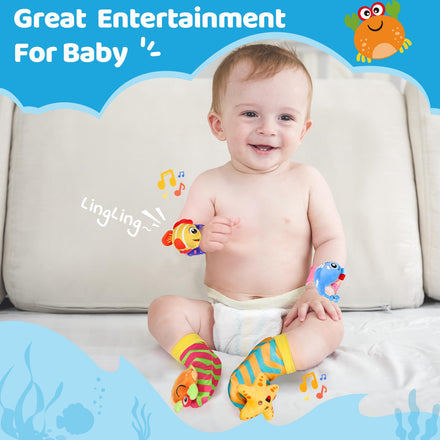 • 【Adorable Companions for Little Explorers】Delight your little one with these adorable baby toys specially designed for infants aged 0–12 months. The baby toy set includes a pair of soft wristbands and socks, each featuring a cute animal plush that instantly captures a baby's attention.