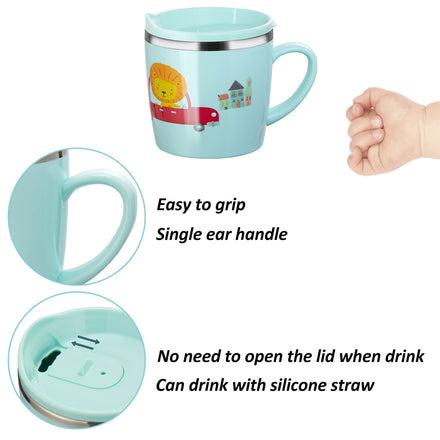 Valueder Kids Baby Toddler Cups Mug Sippy Learning Trainer Cup for Milk Coffee Hot Chocolate Stainless Steel Trainer Straw Cup with Lid, Lion, 7oz/Peacock blue