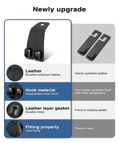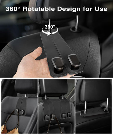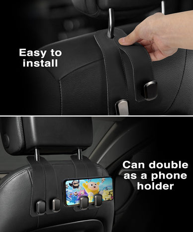 VETERBONE Car Hooks for Headrest, 2Pcs Seat Back Storage Hook Luxurious Leather 100% Metal Multifunctional Car Hanger & Holder for Heatrest, Seat, Bag, Purse (Black)