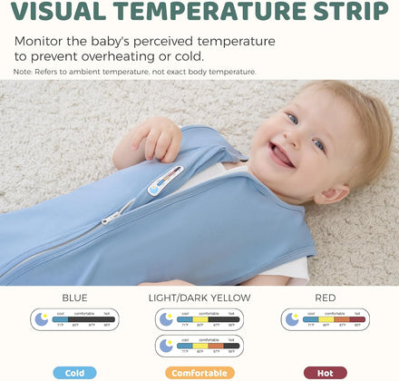 • Temperature Sensing: The sleep sack features an innovative visual color-changing temp strip that displays the surface temperature in contact with the skin, helping parents quickly check if the baby is too hot, too cold, or comfortably warm